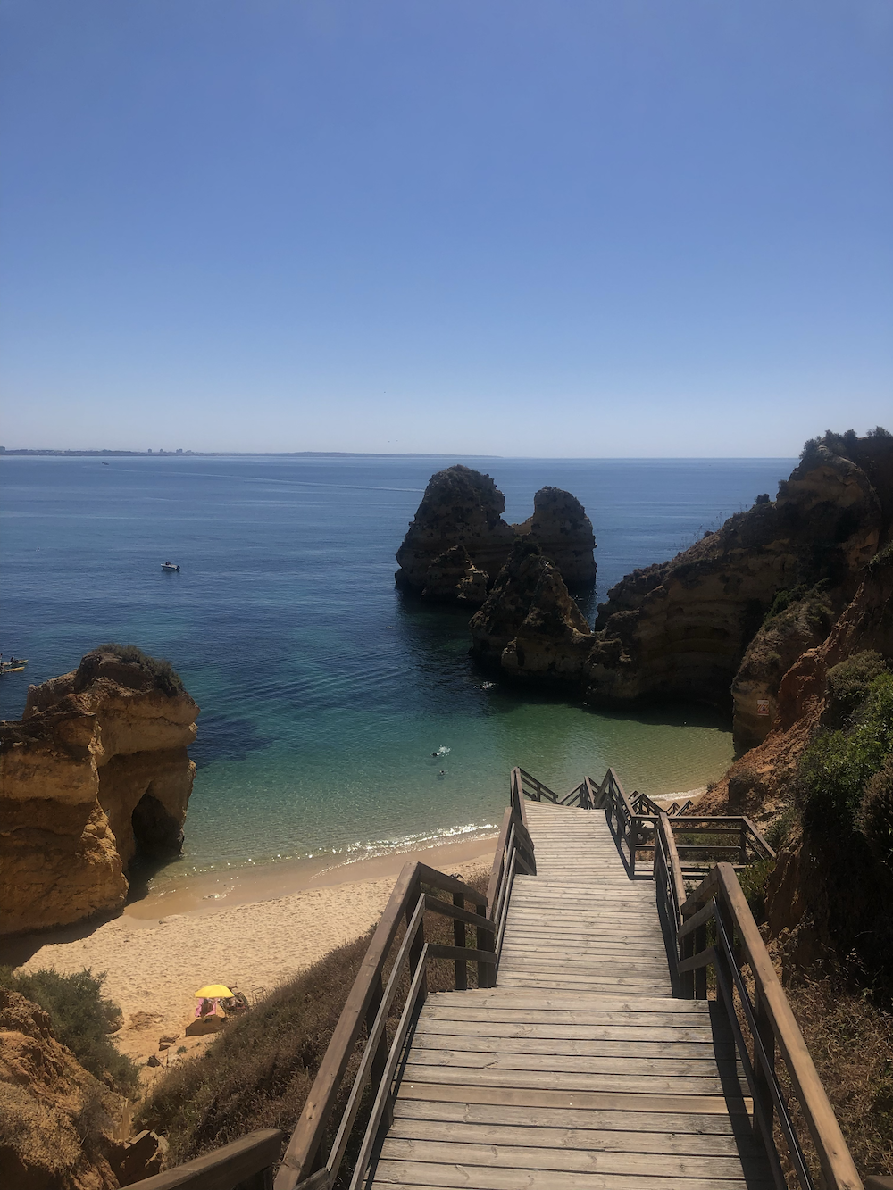 Pocos turistas, como mi novio Flo y yo, han descendido en tiempos de pandemia por los más de 200 escalones que llevan a Playa Camilo en el sur de Portugal. La playa es como una cajita de fósforos con acceso directo al mar, rodeada de formaciones rocosas del tamaño de edificios de unos diez pisos y cuyos colores recuerdan a una torta en capas que va desde el ocre claro hasta el cenizo. Es una playa donde el mayor ruido proviene del agua rozando la arena.